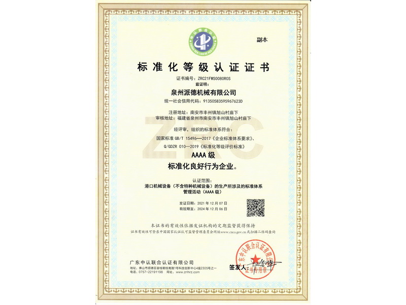 標(biāo)準(zhǔn)化等級認(rèn)證證書